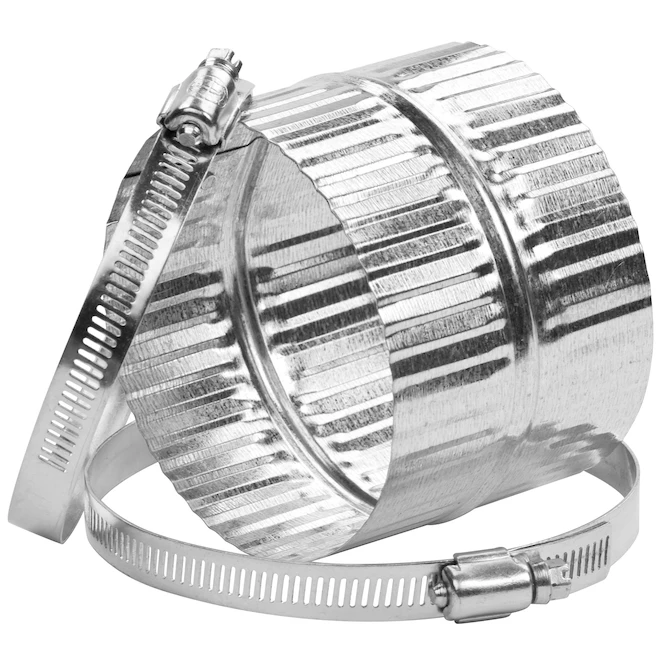 Imperial duct connector set. Crimped galvanized steel flexible duct connector. Used to join 2 lengths of 4-inch ducts together. Set includes a 4-inch galvanized connector and 2 x 4-inch worm gear clamps.