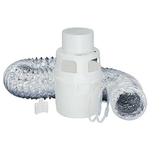 The Imperial indoor dryer Installation kit includes one (1) 4″ x 5′ flexible 4-ply aluminum foil duct, UL approved, two (2) 4″ metal tension clamps, one (1) mounting bracket, two (2) screws and one (1) Indoor lint reservoir, to which the user adds water to catch the lint. The kit recirculates the heat and allows the recuperation of lint when outside venting is not possible.